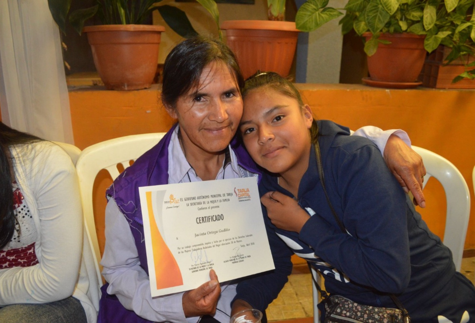 Jacinta Ortega junto a su hija muestra su certificado como trabajadora del hogar. Foto: Acceso.