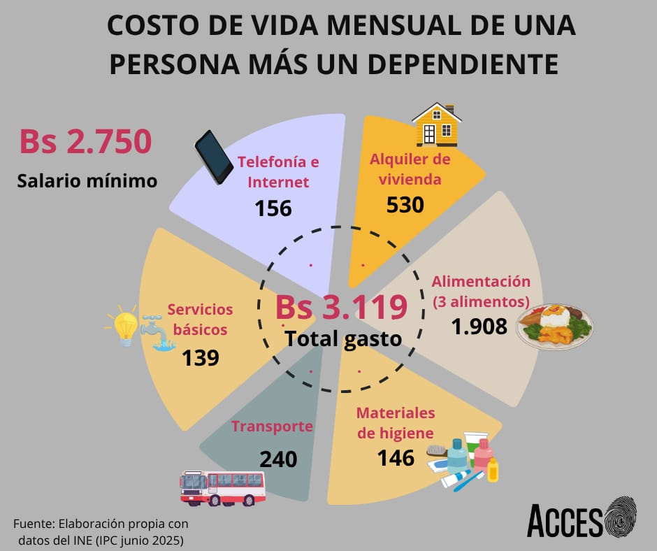 El salario mínimo es de 2750 bolivianos (211 dólares al cambio del dólar paralelo) resulta insuficiente para cubrir el costo de vida básico de una persona con un dependiente, que alcanza los 3119 bolivianos mensuales (239,92 dólares). Esto significa que sus gastos superan sus ingresos en 369 bolivianos, 13,42 % más de lo que percibe con salario mínimo.