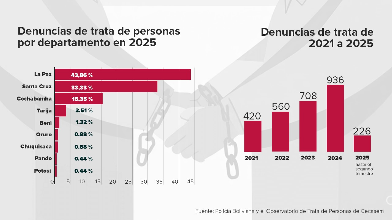 El capitán Diego Patzi, jefe de la División de Trata y Tráfico de Personas de la Fuerza Especial de Lucha Contra el Crimen (Felcc), explica que reciben entre cinco a diez reportes al día. De ese total, asegura, el 80 % logra resolverse.