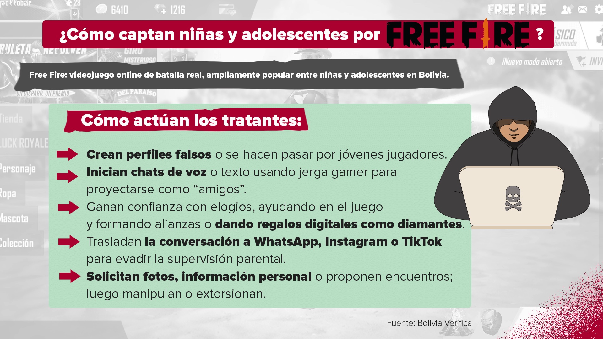 Israel Mariño, responsable del área de sistemas de la fundación Munasim Kullakita, y Wara Delgadillo del Castillo, a cargo del Observatorio de Trata de Personas del Centro de Capacitación y Servicio para la Integración de la Mujer (Cecasem), coinciden en algo esencial: Free Fire no es el único terreno fértil para los tratantes.