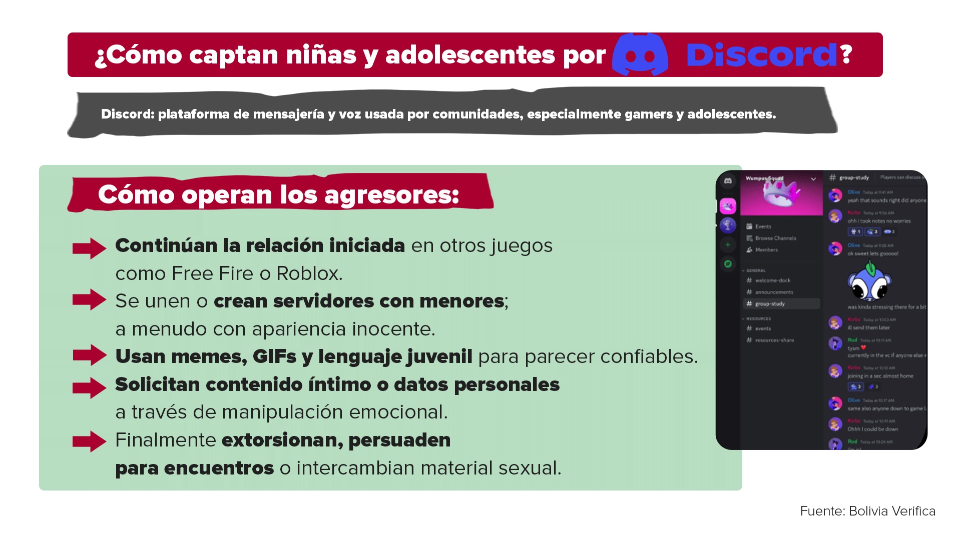 Sobre Discord, Mariño indica que funciona como una extensión del enganche inicial. Una vez ganada la confianza de la víctima en el videojuego, el tratante suele llevar la conversación a esta otra plataforma, donde el contacto es más directo, privado y prolongado.