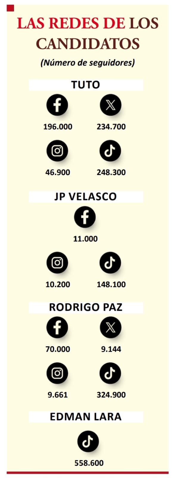 La campaña en redes, particularmente en TikTok, irrumpió como un factor relevante en la primera vuelta. El binomio Paz-Lara capitalizó esta plataforma de manera notoria. Edman Lara, a través de su cuenta “Nuevas Ideas con Libertad”, acumuló 558 600 seguidores y destacó por su constancia, transmisiones en vivo y una comunicación directa con sus potenciales votantes.
