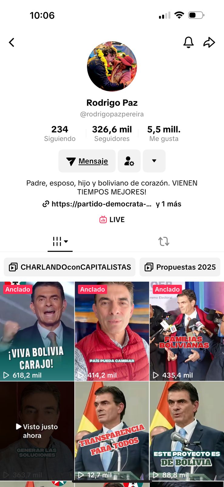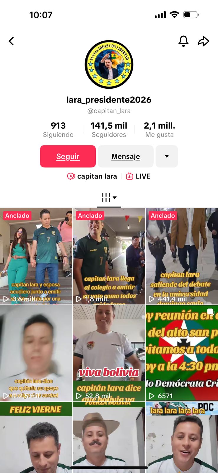 Paz, con 324 900 seguidores en TikTok, también mantuvo una actividad constante. Su video más visto, en el que aborda su propuesta de implementar un salario universal para las mujeres, logró más de 4,7 millones de reproducciones. El candidato a la presidencia se muestra en sus contenidos interactuando con ciudadanos en distintas localidades, lo que proyecta la imagen de alguien cercano y con amplio recorrido nacional. Tanto Paz como Lara, hasta ahora, han optado por videos de estilo casero, grabándose a sí mismos.