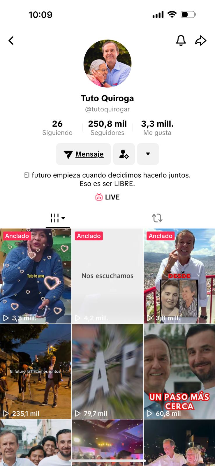 Tuto Quiroga, con 248 300 seguidores en TikTok, también mantuvo una presencia activa en esta plataforma durante su campaña, aunque con un enfoque de producción diferente. Su video más popular, en el que comparte un desayuno con una ciudadana que expresa sus preocupaciones sobre el estado de la economía, sumó 4,2 millones de reproducciones.