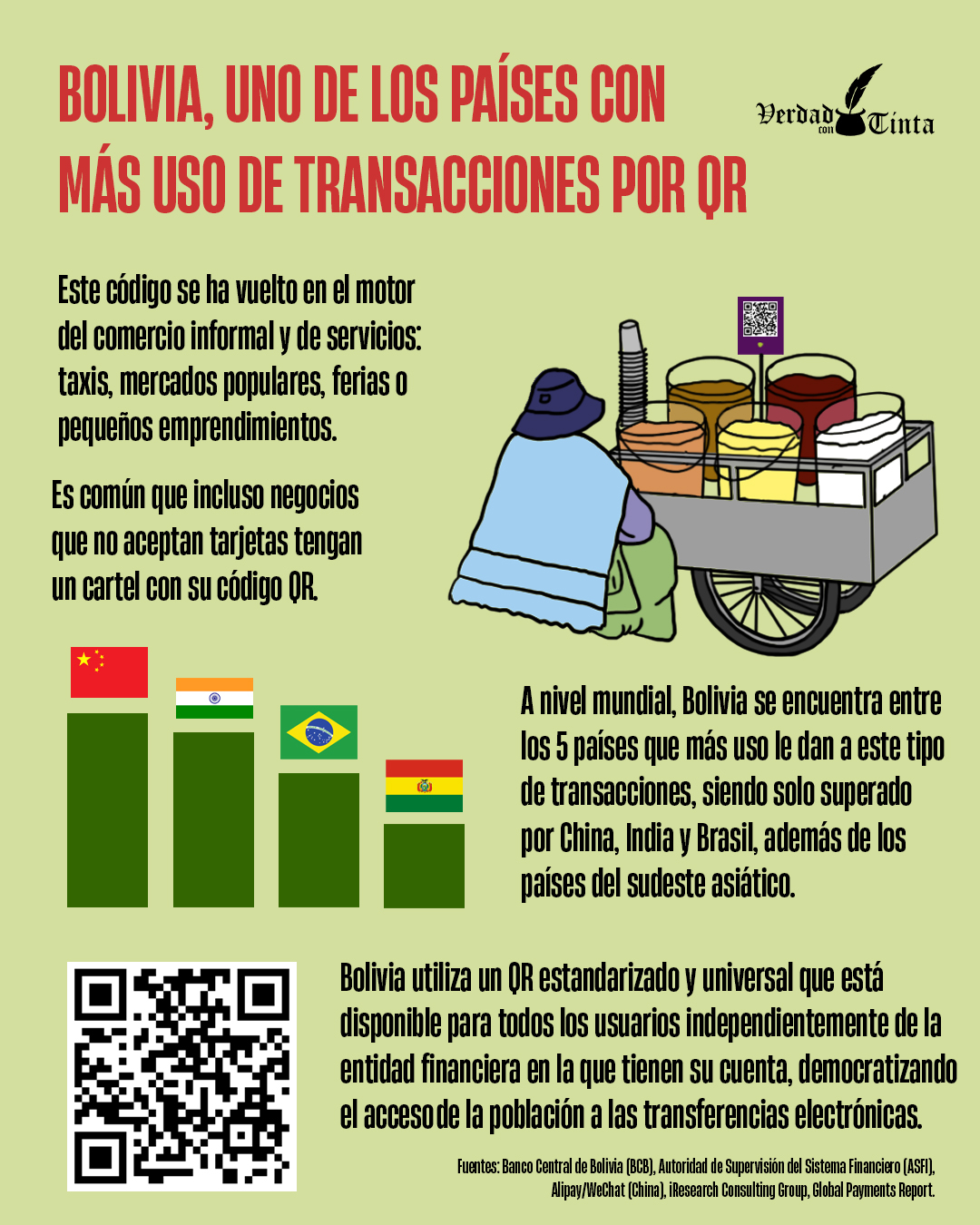 A nivel mundial, Bolivia se encuentra entre los 5 países que más uso le dan a este tipo de transacciones, siendo solo superado por China, India y Brasil, además de los países del sudeste asiático, según datos recopilados de Global Payments Report, iResearch Consulting Group y Alipay/WeChat, entre otros.