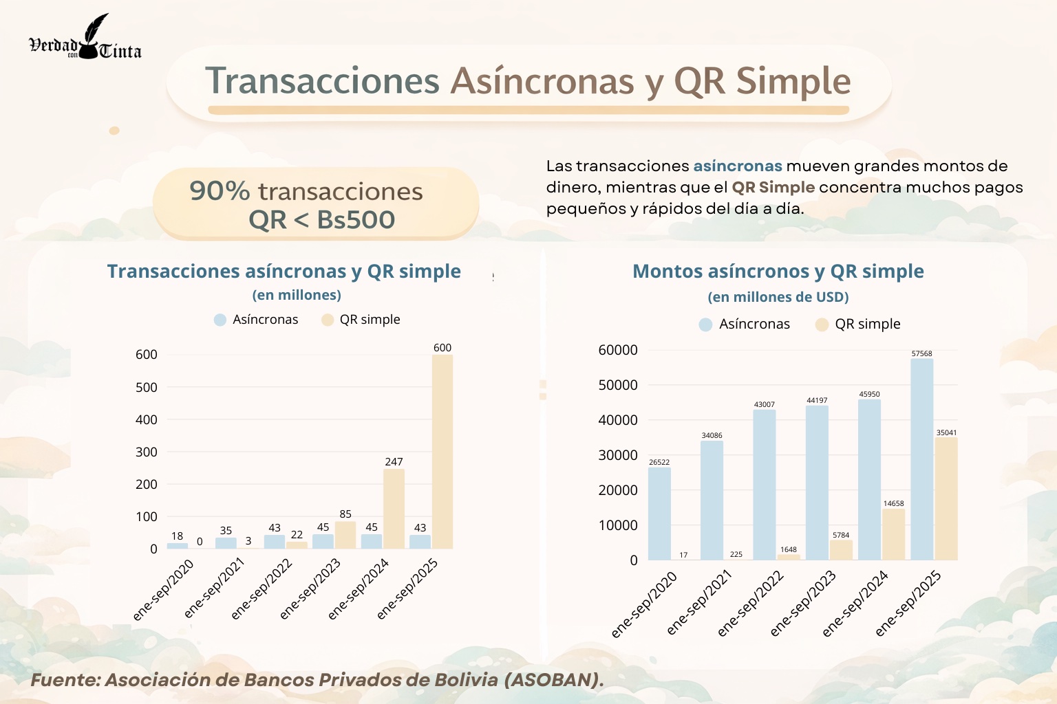 Según el informe del Banco Central de Bolivia (BCB) en los primeros cinco meses de 2025 se procesaron 605 millones de operaciones electrónicas, con un incremento del 89 % respecto al mismo periodo de 2024. De este volumen, 347 millones corresponden a transferencias de fondos, donde el pago con QR lidera con 295 millones de transacciones.